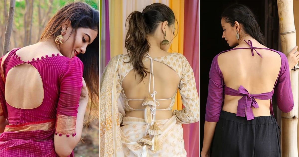 Here we have listed back neck blouse designs that include embroidery work, patchworks, deep cuts, and tassels and bows:
