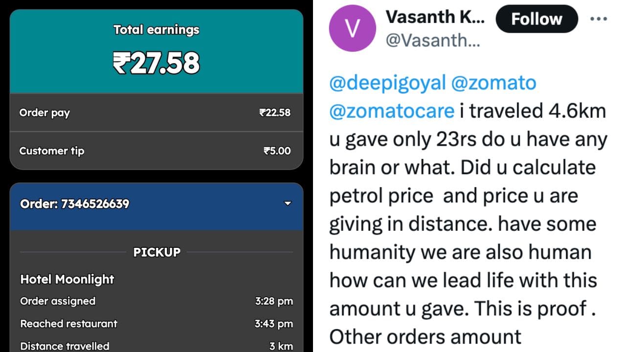 Zomato has once again found itself in the middle of controversy after a delivery agent named Vasanth Kumar took to X and shared screenshots of his earnings, exposing the extremely low payouts given for long-distance deliveries. In his post, he directly tagged Zomato and its CEO Deepinder Goyal, writing,